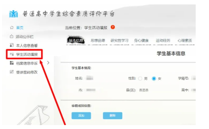 步骤1:点击系统左边操作栏目的【学生活动填报】;