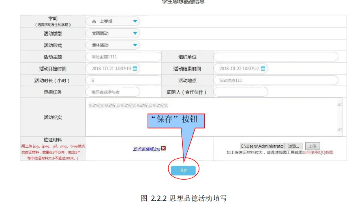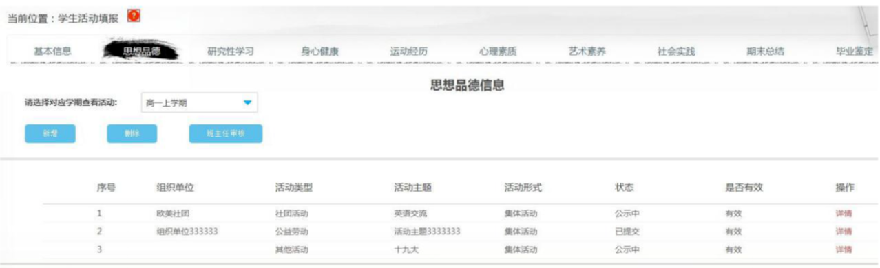 步骤2:选择思想品德、研究性学习、运动经历、艺术素养、社会实践中对应的活动栏目,如图2.2.1 所示:
