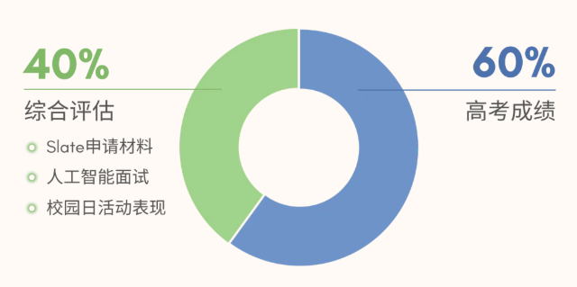 昆山杜克大学将综合评估申请者高考成绩 (权重60%)、以及学校自主综合评估成绩 (权重40%,包括对Slate入学申请材料和人工智能面试结果的评估以及申请者“校园日活动”表现),按照“6-4”模式进行综合评分,择优录取。