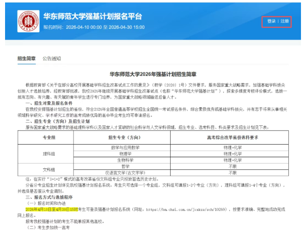 华东师范大学强基计划报名时间:2026年4月10日至4月30日15时,考生登录强基计划报名系统https://bm.chsi.com.cn/ jcxkzs/sch/10269完成报名,北京高考在线整理了华东师范大学2026强基计划报名流程,供考生参考。
