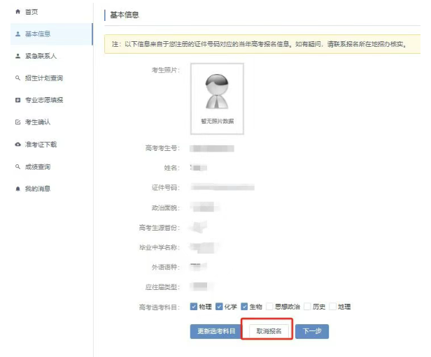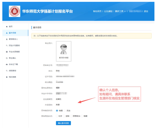 核对“报名基本信息”页面显示信息。高考改革省份的考生还需勾选选考科目。
