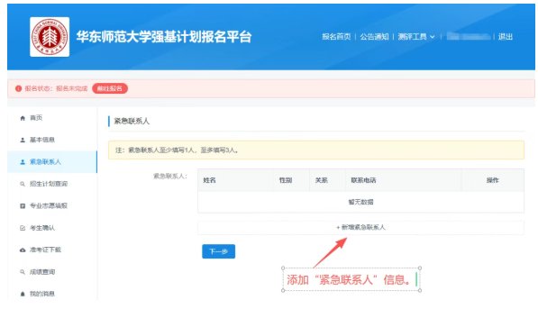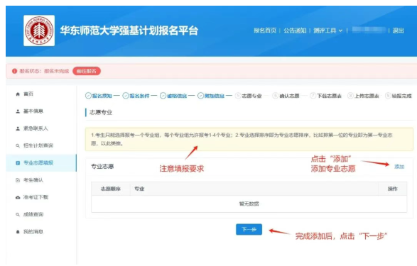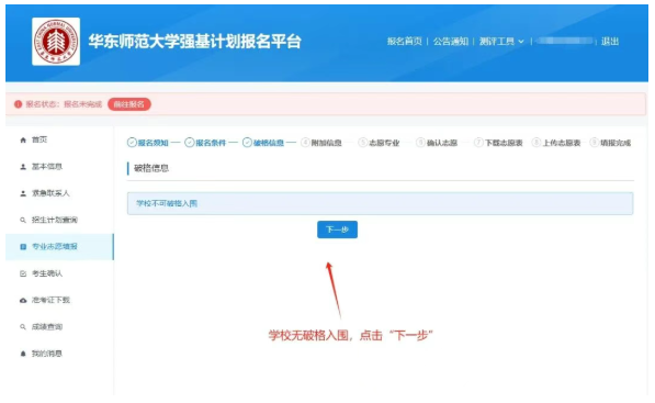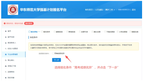 选择报名条件“高考成绩优异”,并点击“下一步”。
