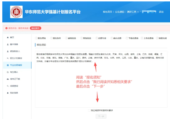 阅读“报名须知”,勾选“我已阅读并知悉相关要求”,点击进入下一步。