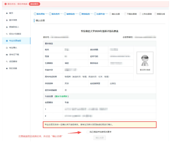 请仔细核对志愿信息。一旦确认专业志愿将不能更改;如需更改只能在报名时间段内取消报名后重新报名。
