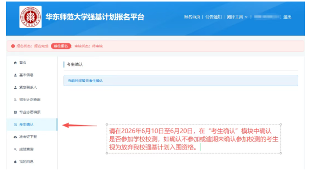 考生须在2026年6月10日至6月20日进入报名系统确认参加学校校测。对于确认不参加校测或逾期未确认参加校测的考生视为放弃我校强基计划入围资格。
